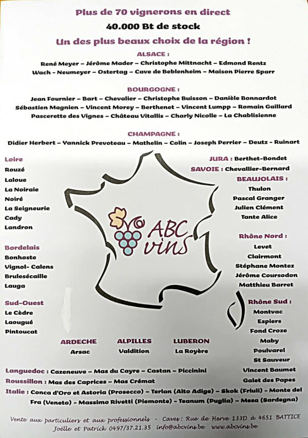 - Vous envoyez votre commande par mail à info@abcvins.be avec vos coordonnées complètes ou vous contactez Patrick au 0497/37.21.35